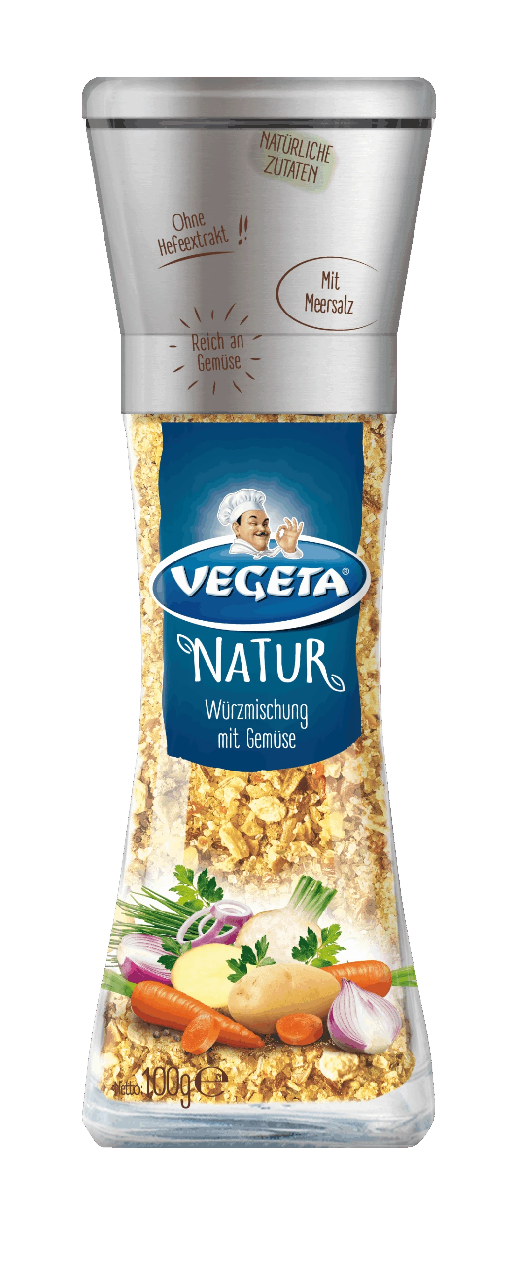 VEGETA Natur Würzmischung mit Gemüse und Kräutern. Im mediterranen Stil verfeinert mit Tomaten, Rosmarin, Basilikum und Oregano.